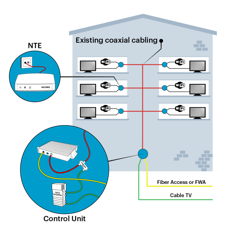 InCoax Enabled Property-wide Managed WiFi over MoCA Access provides reliable Gigabit to MultiGigabit broadband over the in-building coax, enabling uniform WiFi throughout apartments, common indoor and outdoor areas. Internet services are delivered to the different media hubs and the system may co-exist with existing TV solutions. It offers a sustainable, cost-effective way to upgrade broadband distribution.